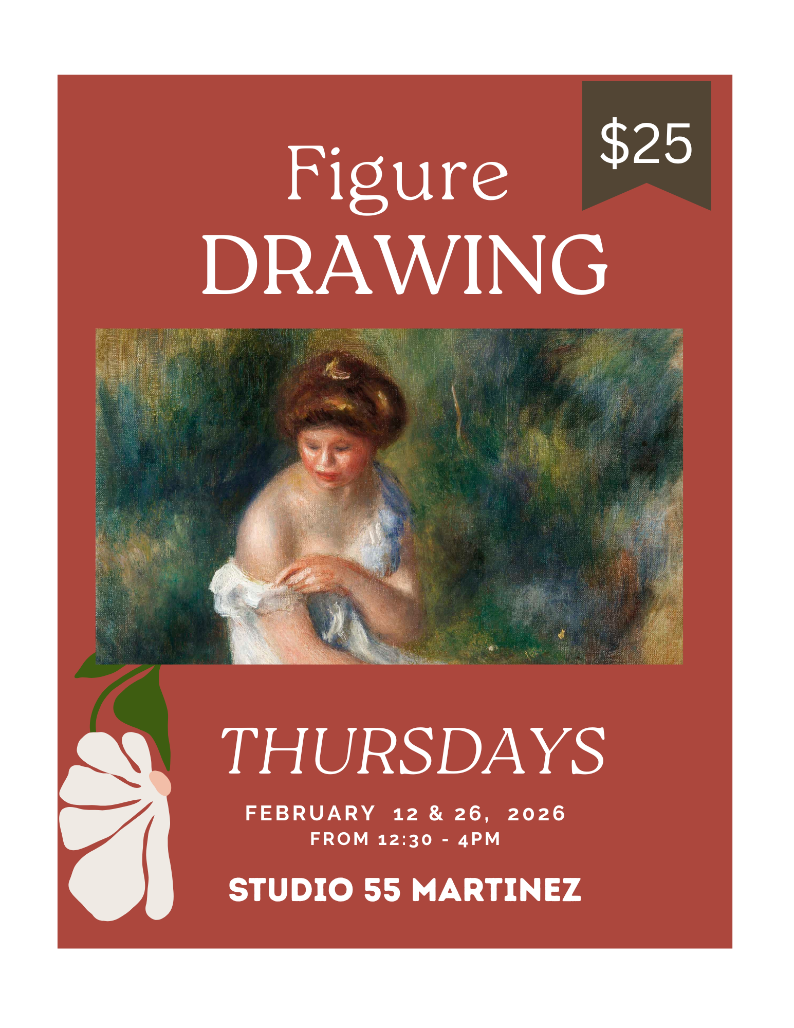 Live Drawing at Studio 55: Set up starts at 12:30pm and we have the model from 1-4p. We start with 20 minutes of nude gesture poses to warm up. Then we have one long pose at least partially clothed for the remainder of the time, with breaks for the model. We hire professional models from the Bay Area. The cost per artist is $25 which includes model tip.