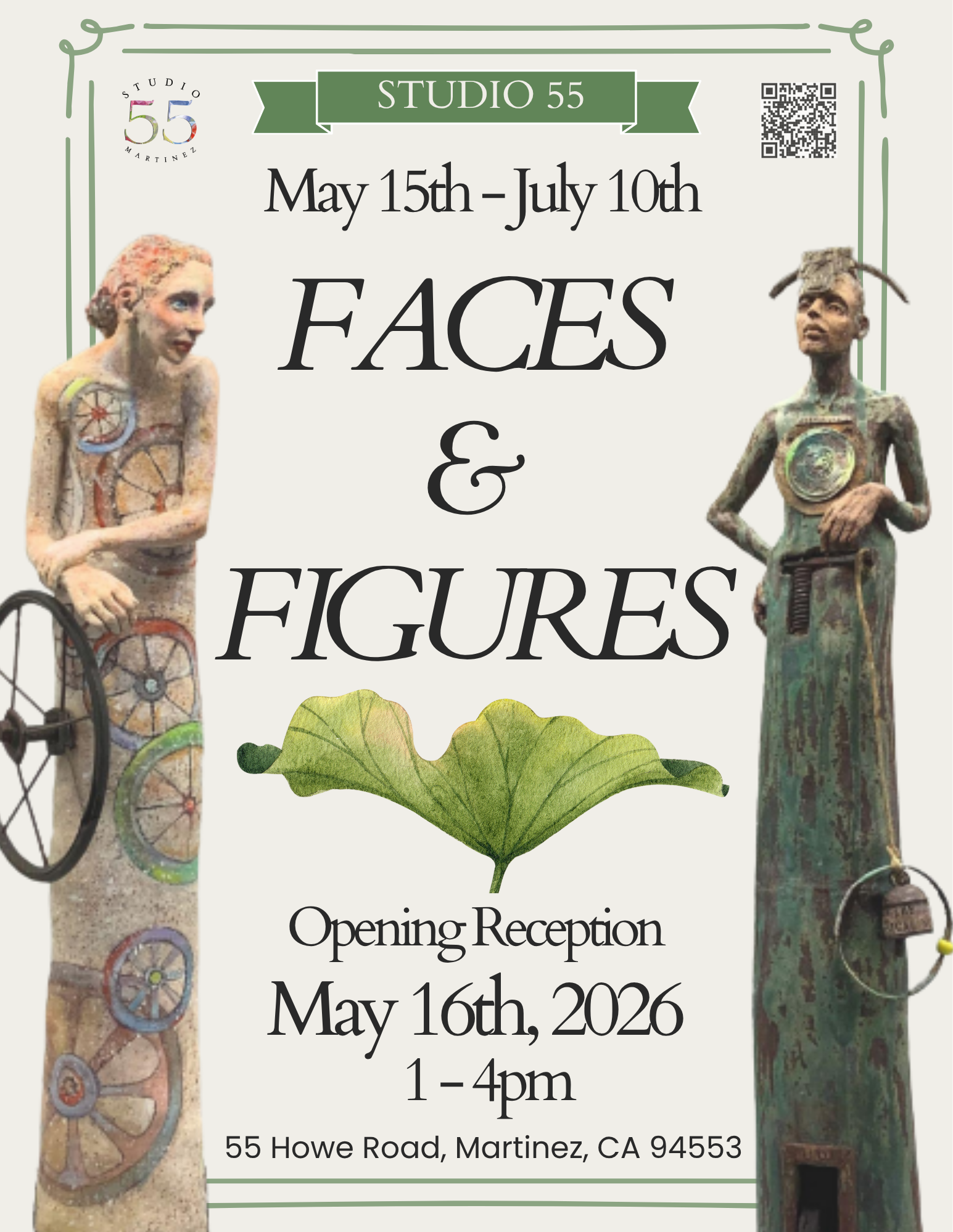 Faces & Figures Opening Reception Saturday, May 16, 2026 1:00 PM 4:00 PM Studio 55 Martinez 55 Howe Road Martinez CA United States (map) Google Calendar ICS