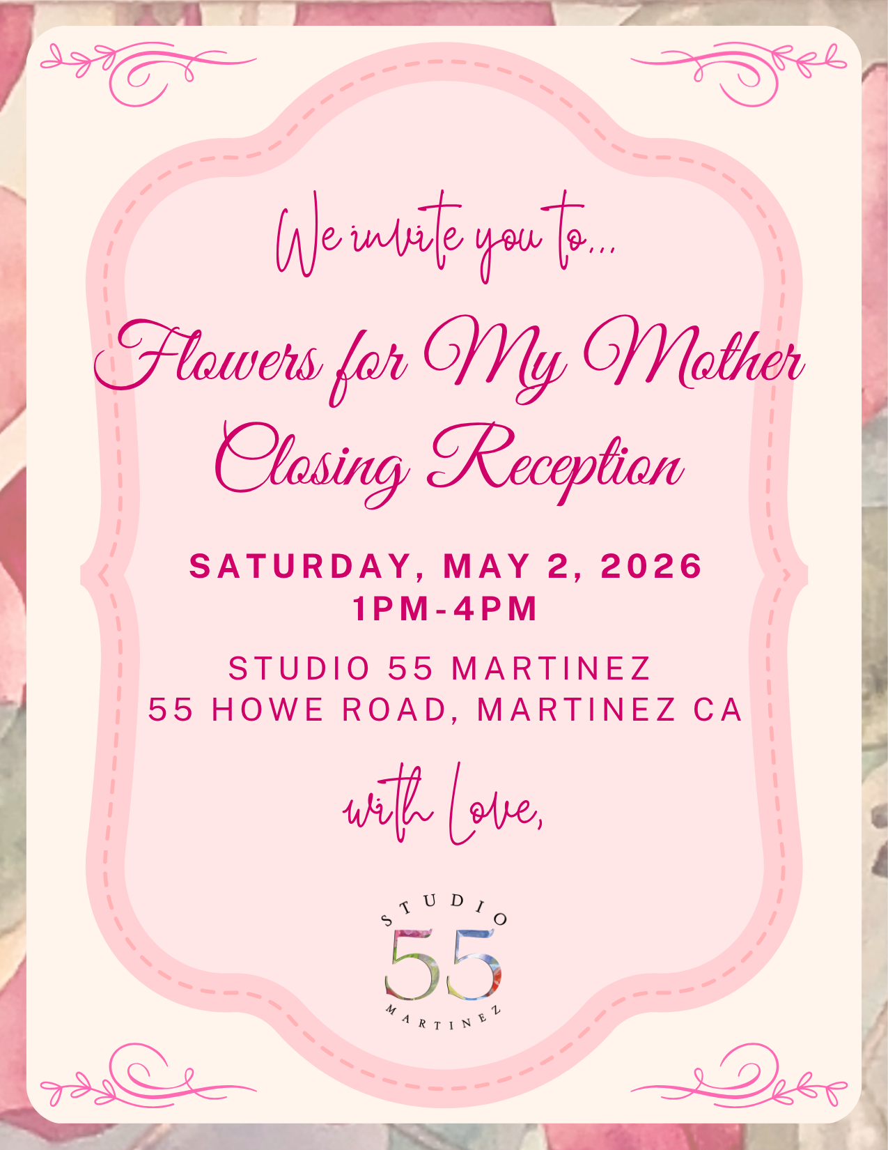 Flowers for My Mother Closing Reception Saturday, May 2, 2026 1:00 PM 4:00 PM Studio 55 Martinez 55 Howe Road Martinez CA United States (map) Google Calendar ICS