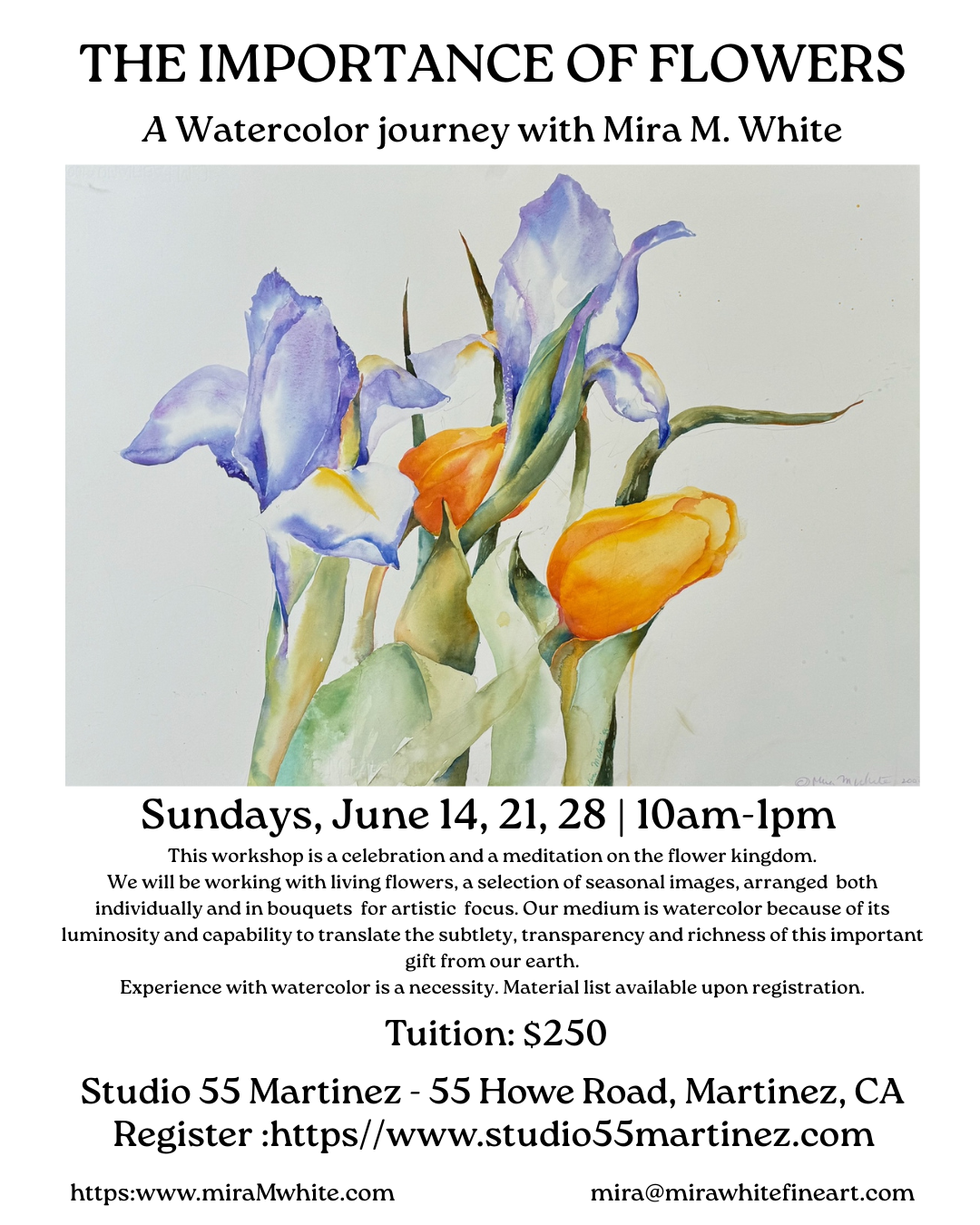 We will be working with living flowers, a selection of seasonal images, arranged both individually and in bouquets for artistic focus. Our medium is watercolor because of its luminosity and capability to translate the subtlety, transparency and richness of this important gift from our earth.